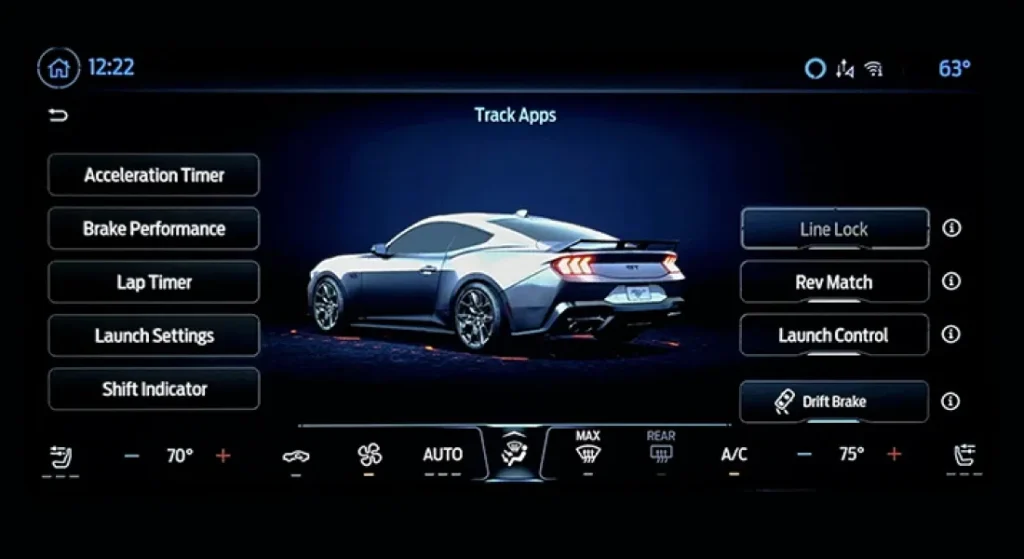 Standard on all models, performance metrics are instantly provided in the instrument cluster. Accelerometer displays lateral and longitudinal g-forces, acceleration times and lap times, plus automatic and countdown starts. Also included are features like electronic line-lock* and launch control* (manual only). Electronic line-lock keeps the front brakes locked while Mustang is in gear to warm up the rear tires. Launch control integrates brakes, traction control and powertrain control to help ensure smooth, consistent starts. *Track use only.